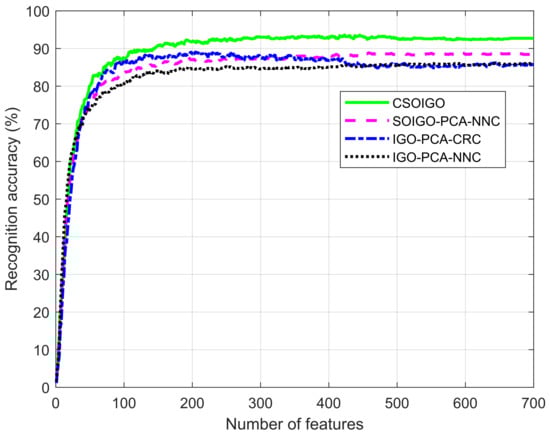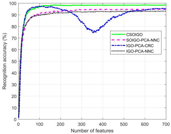 As in the previous subsection, we show the recognition accuracy against the number of features in Figure 8. It can be seen that as the number of features increases, the recognition accuracies of IGO-PCA-NNC, SOIGO-PCA-NNC, and CSOIGO also increase. The recognition accuracy of IGO-PCA-CRC firstly increases, then decreases to some extent, and then it increases again. When the number of features exceeds 108, CSOIGO always achieves higher accuracy than its competing methods. This again demonstrates that CSOIGO is robust to mixed variations in face images.