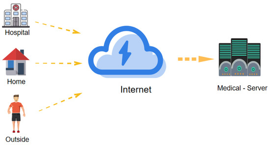 With the development of IoT technology, more and more electronic healthcare systems apply this technology, which makes wireless smart healthcare treatment possible. At present, many various electronic healthcare systems have been proposed [9,10,11,12,13,14,15,16,17,18]. A typical EHS model is shown in Figure 1. No matter where the patient is or who has deployed the sensors, the patient can forward collected medical data to the Medical-Server with the aim of obtaining medical suggestions in time. In order to obtain the best treatment time, it is very important to reduce the cost of communication and ensure the security of medical data.