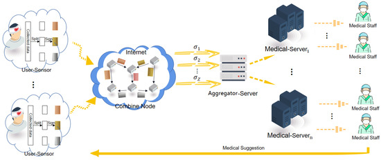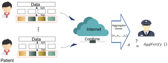 - Aggregator-Server: A device that is honest but curious and has certain calculation and communication capabilities. The device can randomly obtain a Medical-Server’s public key, collect and aggregate a set of the merged data packets. Finally, send the generated aggregate signature to the destination Medical-Server;