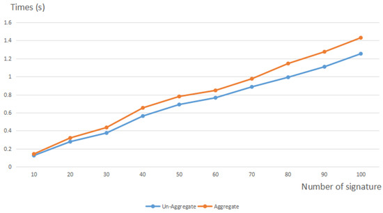 For comparison, we assume that a medical data packet m can be divided into 100 vectors; the dimensional of the vector is 5 and the number of combined vectors is 100. Table 4 and Figure 4 from different directions give the verification efficiency comparison of the Medical-Server, i.e., the un-aggregate scheme and aggregate scheme. In Figure 4, the y-axis represents the time required to verify the signature, and the x-axis represents the number of signatures verified. In the aggregation experiment, we take one Medical-Server as an example. The number of signatures that the Aggregator-Server waits for before aggregation is set to 10, 20, 30, 40, 50, 60, 70, 80, 90, 100. In order to resist coalition attacks, more pairing operations are required in the process of aggregation verification, which leads to more verification overhead. As can be seen from Figure 4, the gap is negligible, and the computing power of the Medical-Server is very strong, which can complete this overhead.