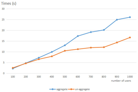 In order to fit the practical application, we chose a larger number of users for the experiment. The number of users l ranges from 100 to 1000 with an interval of 100. We make the y-axis represent the time required to verify the signature, and the x-axis represent the number of users. For the security of the aggregate signature, we have to pay for a certain verification efficiency. As shown in Figure 5, the verification efficiency of un-aggregate scheme is higher than that of aggregate scheme. It can be seen that this overhead gap is not large. Moreover, it also saves storage cost. The experiment results indicate that our proposed LHAS scheme is practical for EHS.