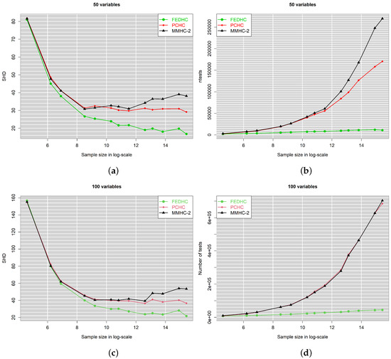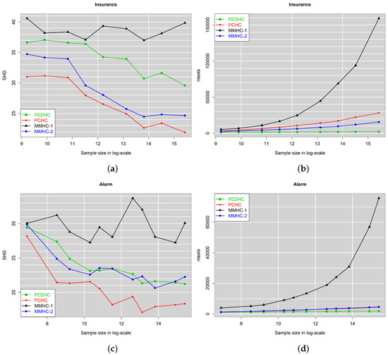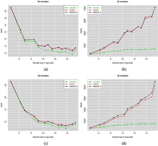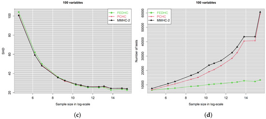 Figure 10 shows the SHD and the number of CI tests executed by each algorithm against the sample size. The MMHC-1 evidently has the poorest performance in both axes of comparison. Our implementation (MMHC-2) performs substantially better, but the overall winner is the PCHC. FEDHC, on the other hand, performs better than MMHC-1, yet is the second-best option.
