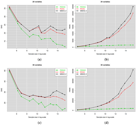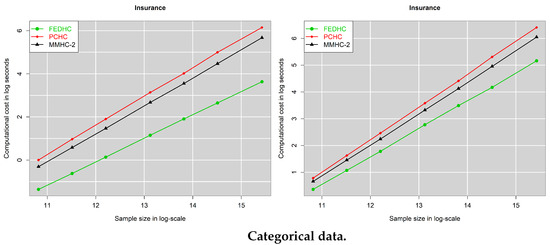 The computational cost of each algorithm was also measured, appearing in Figure 11 as a function of the sample size. The empirical slopes of all lines in Figure 11 are nearly equal to 1, indicating that the scalability of FEDHC, PCHC, and MMHC-2 is linear in the sample size. Hence, the computational cost of all algorithms increases linearly with respect to the sample size. For any percentage-wise increase in the sample size, the time increases by the same percentage. Surprisingly enough, the computational cost of MMHC-1 was not evaluated for the categorical data case, because similarly to the continuous data case, it was too high to evaluate.