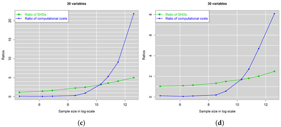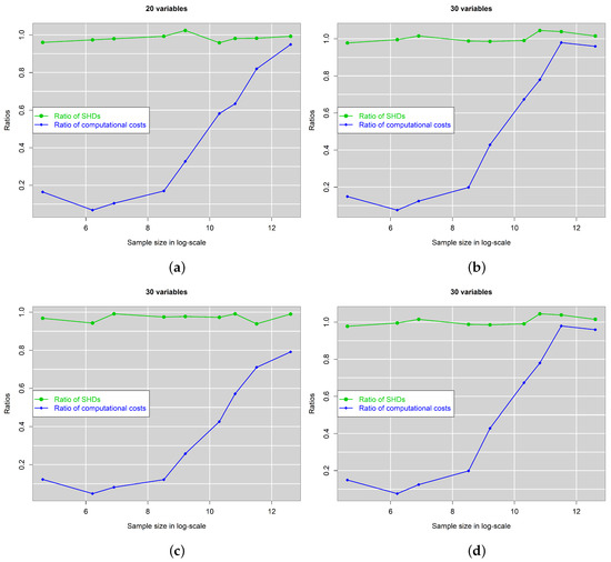 The function utilised in the continuous data case relies on the coefficients. The larger the magnitude of their values, the stronger the association between the edges becomes, and hence, it becomes easier to identify them. For BNs with categorical data, one could apply the same generation technique and then discretise the simulated data. To avoid biased or optimistic estimates favoring one or the other method, two real BNs with categorical data were utilised to simulate data. These are (a) the Insurance BN, used for evaluating car insurance risks [45], which consists of 27 variable (nodes) and 52 (directed) edges and (b) the Alarm BN, designed to provide an alarm message system for patient monitoring, and consists of 37 variables and 45 (directed) edges. The R package bnlearn contains a few thousand categorical instantiations from these BNs, but for the purpose of the simulation studies more instantiations were generated using the same package. The sample sizes considered were .