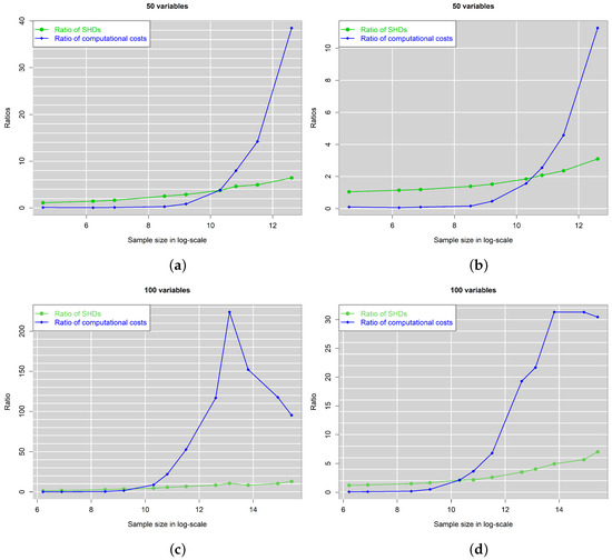 Ratios of SHD and computational cost against log of sample size for 50 and 100 dimensions with 3 neighbours and 5 neighbours on average. The ratios depict the errors and computational cost of the raw FEDHC relatively to the robustified FEDHC with 5% outliers. (a,c) 3 neighbours. (b,d) 5 neighbours.