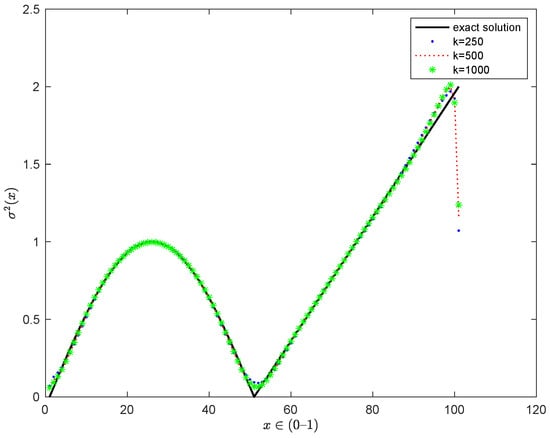 The problem P was first considered by Dupire in [12]. In his paper, Dupire applied the symmetric property of the transition probability density function to replace the option pricing inverse problem with an equation that contains parameters K, T and Dupire’s proposed formula for calculating the implied volatility. Although Dupire’s formula is seriously ill-posed, the solution of Dupire provided the foundation for later understanding of this problem. Time-dependent and space-related volatility has been studied in [4,5]. For space-dependent volatility, authors generate a broad class of non-Gaussian stochastic processes. By using the dual equation, the problem is transformed into a inverse coefficient problem with final observations and some new uniqueness and stability theorems are established. In [6,7,8], an optimal control framework is applied to determine implied volatility in option pricing. A rigorous mathematical analysis about the existence, necessary condition and convergence of the inverse problem is made. The authors propose a well-posed approximation algorithm to identify the coefficients. In recent years, the linearization method has been applied to the inverse volatility problem in option pricing. In [13,14,15], the linearization method is applied to transform the problem P into an inverse source problem in classical parabolic equation, from which an unknown volatility can be recovered. However, there are several deficiencies in these studies that need to be improved. One of the significant deficiencies is the assumption that the original problem P is in the unbounded region, and it is under this assumption many scholars conducted numerical simulations by applying the artificial truncation. There is a potential issue in this approach; that is, if the truncation interval is too large, it will increase the amount of calculation, and if the truncation interval is too small, it will increase the error. In practical applications, this approach may fail to control the volatility risk. There are a number of papers devoted to this problem, see, e.g., [16,17,18,19].