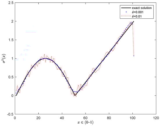Analogously, we also consider the noisy case, where the noisy levels are and . The corresponding numerical result is shown in Figure 4. Finally, some computation parameters and for the exact case and noisy one are given in Table 2.