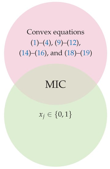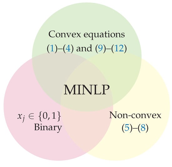It is worth mentioning that one of our proposal’s distinct features is its solution approach, as this research focuses on the mathematical structure of the exact MINLP model that represents the studied problem, as well as the possibility of transforming it into a mixed-integer convex model [,].