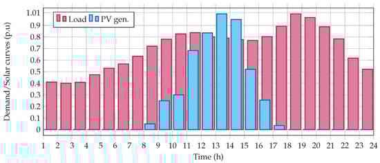The mean average generation and demand curves for the metropolitan area of Medellín, Colombia, were used to model the daily behavior of the demand and generators in two test feeders. These curves are plotted in Figure 4.