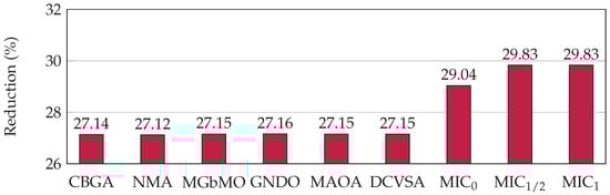 To compare the effectiveness and robustness of the proposed MIC model in determining the optimal PV sizes and locations, as well as their daily dispatch, multiple metaheuristic algorithms available in the current literature were used, namely (i) the Chu and Beasley Genetic Algorithm [], (ii) the Newton Metaheuristic Algorithm (NMA) [], (iii) the Modified Gradient-Based Metaheuristic Optimizer (MGbMO) [], (iv) Generalized Normal Distribution Optimization (GNDO) [], (v) the Modified Arithmetic Optimization Algorithm (MAOA) [], and (vi) the Discrete-Continuous Vortex Search Algorithm (DCVSA) [].