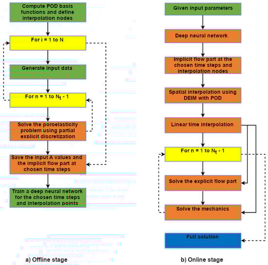 poroelasticity; machine learning; explicit–implicit scheme; discrete empirical interpolation method; proper orthogonal decomposition MSC: