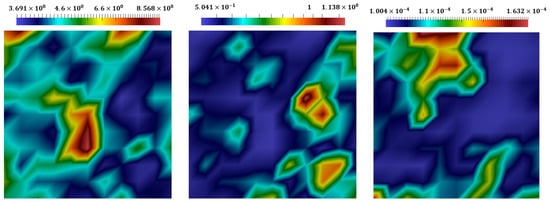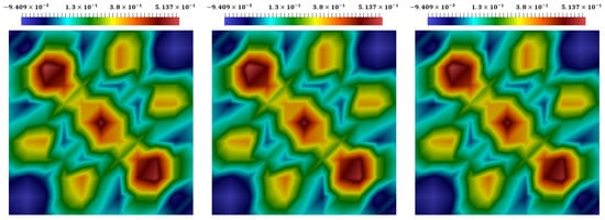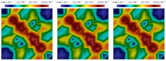Distributions of the stress at the final time. The coupled explicit–implicit solution, the split explicit–implicit solution, and the proposed approach’s solution (from left to right).