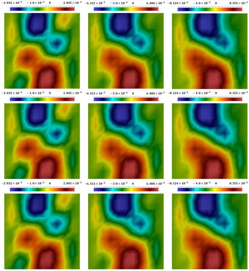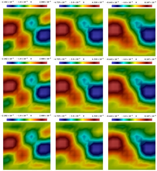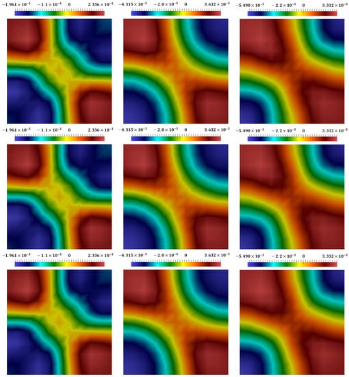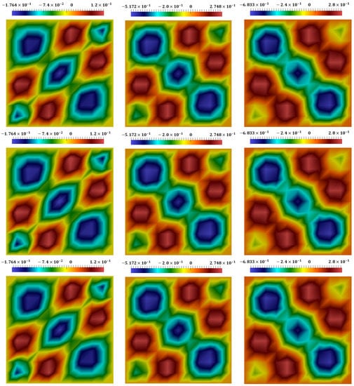 Distribution of displacement in direction at different times, with (from left to right). (The first row): the coupled explicit–implicit solution. (The second row): the split explicit–implicit solution. (The third row): the proposed approach’s solution.