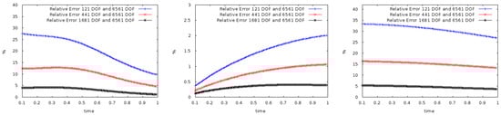 Relative errors in % for the reference mesh (6561 vertices) with other meshes (121, 441, and 1681 vertices) for the first and second continuum and displacement (from left to right).