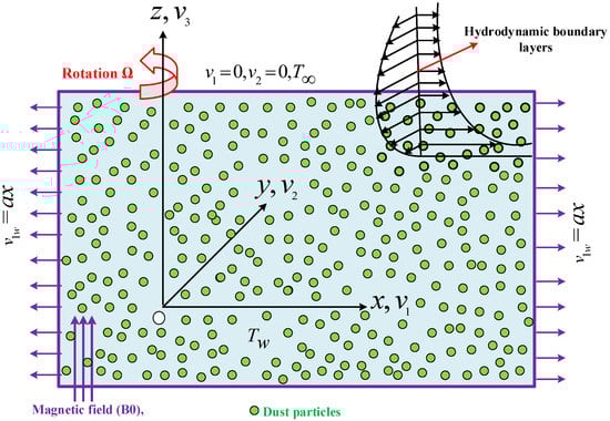 Let us analyze a incompressible time-independent 3D rotating laminar flux of dusty micropolar fluid across a stretching sheet. The sheet is stretched in -plane and fluid placed along the z-axis. Fluid revolves with constant velocity around the z-axis. The feature of Coriolis forces in the primary momentum and secondary momentum equations are , respectively. Although the first body force is positive, the velocity of secondary flow is negative, which creates an overall negative impact on the fluid primary velocity. The apparent and intended are two observable two paths in a rotatory frame of reference. The case of the intended/true path produces a trajectory that is easily deformed by some fictitious force, known as the Coriolis force, which influence the apparent path. Both fluid and dust particles were considered to be static at first. Dust particles are assumed to be evenly sized spheres with constant density all over the stream. Further, and are the liquid’s ambient temperature and superficial temperature, respectively. Figure 1 displays the flux attributes and the coordinate system. For dusty phase flux, the model based on boundary layer approximation and physical assumptions and coupled with constraints is as follows [39,40,41].