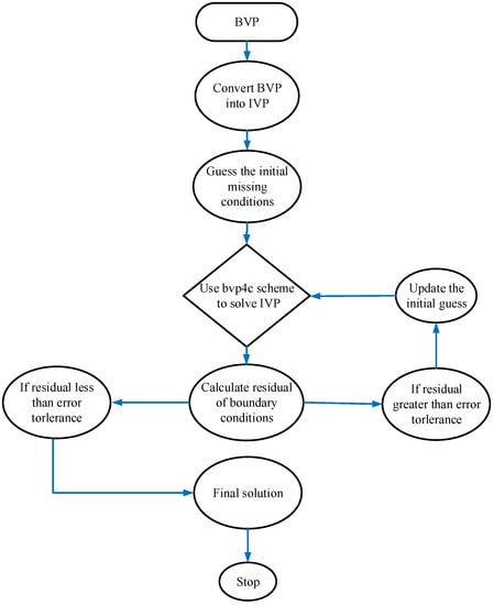 A system of ordinary differential equations represents the flow model. The Equations (11)–(16) are numerically solved using the effectiveness and strength of numerical computing in the bvp4c approach using MATLAB. Ref. [48] provides more details on this solution approach (see Figure 2). The graphical and numerical results show the velocity and temperature fields as different physical factors. The bvp4c technique is used to transform the system of ODEs (11)–(16) into first-order ODEs for a solution: