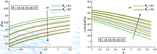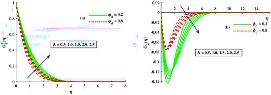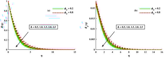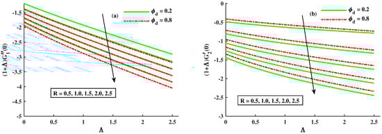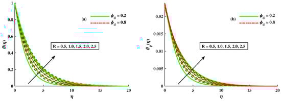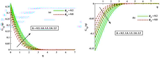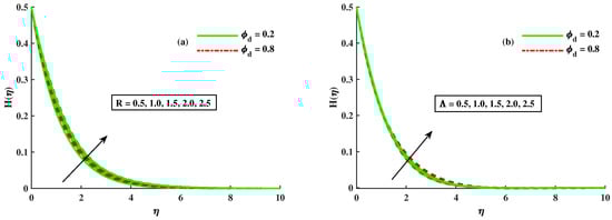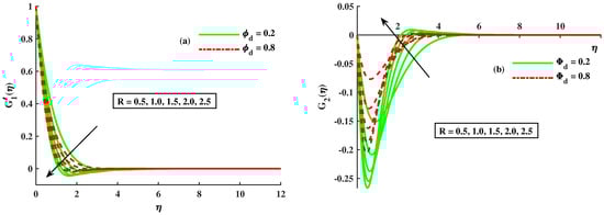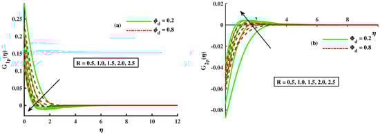 Figure 6a,b demonstrate the affect of and volume concentration of dust particles on dusty phase velocities and . It can be seen that velocity increased and velocity decreased with incremental values of material parameters; both velocities decreased with higher inputs of dust particle concentration. Figure 7a,b display the variation in micro-rotation distribution profile with varying inputs of rotational, material parameter, and concentration of dust particles. From Figure 7a, we can see that the micro-rotation profile was amplified with larger inputs of R, whereas it was reduced against higher inputs of dust particle concentration. Figure 7b reveals that micro-rotation was improved with increasing inputs of parameters. Figure 8a,b illustrate the impact of R and on the temperature and dust phase of the fluid. It is obvious that the temperature of fluid and dusty phase increased with increasing inputs of R and . Basically, the development of heat is satisfied on the base of a higher diffusion process because of increased rotation. Figure 9a,b represent the fluctuation in and by different values of the material parameter and . The fluid temperature and dust phase temperature depreciate against magnified inputs of the material parameter; both phase temperatures rise with larger inputs of . Physically, the higher input of dust particles enhance the base fluid dust concentration, which causes the fluid velocity to decrease; however, the base fluid temperature increased due to the thermal conductivity of the additional dust particles.