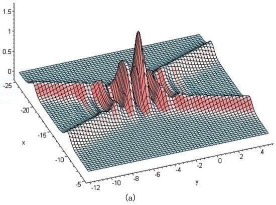 Now, one could use Equation (9), called a “universal” formula in [], to construct a coherent structure of a (2+1) dimensional B-KP equation. Due to the arbitrariness of the functions of and , we will construct some novel localized structures of (2+1) dimensional B-KP equation in the next section.