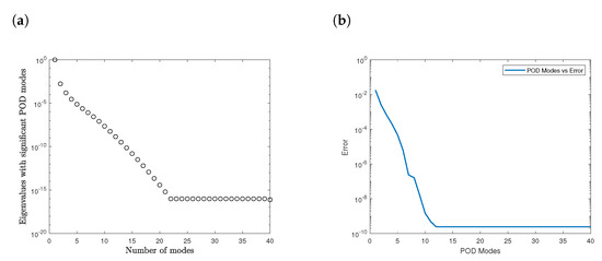 Figure 1a shows the contribution of each POD basis mode. The first 12 modes contained the predominant information where the EUPFD met the theoretical accuracy requirement. The 12 modes were significant in optimizing the linear ADR equation. Figure 1b shows the decreasing error when the number of modes increased.