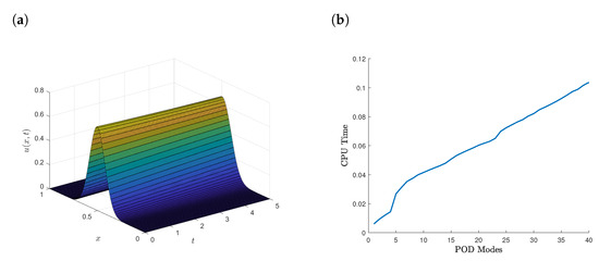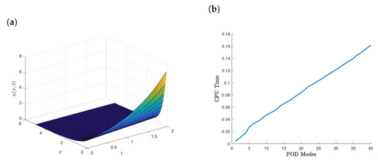 Figure 5a,b and Figure 6 shows the surface plots of the exact, UPFD and EUPFD solutions of the nonlinear ADR equation. Figure 6b shows the increase in CPU time when the number with the increase in POD modes.