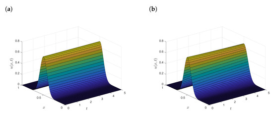 In this section, we set , and in Equation (1) to obtain the nonlinear reaction diffusion equation given below.