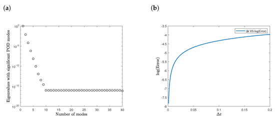 (a) Significant POD modes against number of modes. (b) Absolute error between the exact solution and EUPFD solution against time.