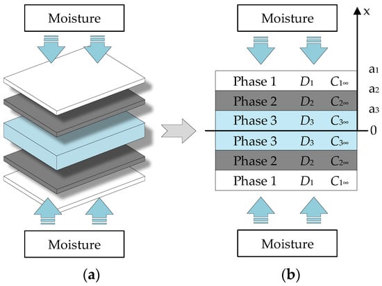The moisture diffusion problem of multiphase symmetrical sandwich structure: (a) Description of multiphase symmetrical sandwich structure; (b) Model of moisture diffusion problem.