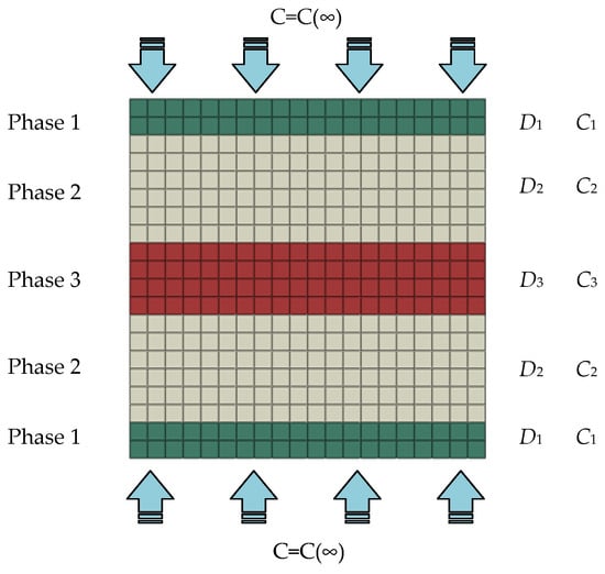 The diagram of multiphase symmetrical sandwich structure is shown in Figure 1a, and the moisture is applied at the upper and bottom surfaces of sandwich structure. To investigate moisture diffusion along the thickness direction, this moisture diffusion problem is simplified as shown in Figure 1b, where the white layer, grey layer and blue layer are defined as Phase 1, Phase 2 and Phase 3. The saturated moisture concentration C∞ is defined as C∞ = M∞/V, where M∞ is saturated moisture uptake and V is volume of the sample []. The saturated moisture concentrations and diffusivities of phase 1–3 are C1∞, D1, C2∞, D2, C3∞ and D3, respectively. The thicknesses of phases 1–3 are a1–a2, a2–a3 and a3, respectively, and C1(x,t), C2(x,t) and C3(x,t) represent the moisture concentrations in phases 1–3, where t is the aging time.