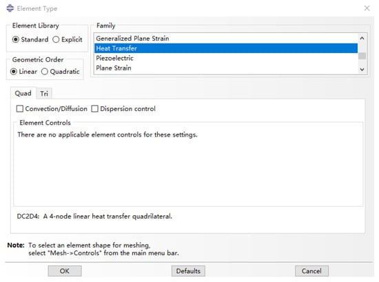 The moisture diffusion of multiphase symmetrical sandwich structures through the thickness direction were solved by the analytical method. To validate the analytical model, the sandwich structure including phase 1–3 was developed in the commercial software Abaqus 6.11. The model established in Abaqus is shown in Figure 3. The mass diffusion method in Abaqus is Fick’s second law (∂ψ/∂t = D∂2ψ/∂x2), which predicts how diffusion causes the concentration to change with time, where ψ represents normalized concentration. A mass diffusion option was used when the materials and steps in Abaqus were set up. Because Abaqus does not have the element type for moisture diffusion in family option, we used heat transfer element instead. The number of mesh element is 400, the element type is a 4-node linear heat transfer quadrilateral. The element type is shown in Figure 4. The boundary condition of analytical method is normalized concentration = 1. This boundary condition is also used in moisture diffusion experiment since water or humid = 100% environment was treated as normalized concentration = 1 at the surface of specimens in experiment. Thus, normalized concentration = 1 was applied at the upper and bottom surfaces.