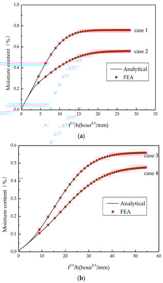 Figure 5 illustrates the moisture uptake comparison of cases 1–4 between analytical results and FEA calculation. Four cases of moisture absorption for multiphase symmetrical sandwich structure were calculated by Abaqus, the thicknesses, diffusivities, and equilibrium moisture contents of phases 1–3 were changed to verify the analytical method by Equation (24). In reference [], we know that the initial moisture uptake is a straight line for Fickian diffusion if we use t0.5 as the x-axis. To conveniently observe whether the moisture is Fickian diffusion, t0.5 or t0.5/h is often used as x-axis [,,]. Here, we use t0.5/h as x-axis. The unit of thickness h is mm and the unit of time t is hour. Compared with the FEA calculation, the analytical results show a good agreement.
