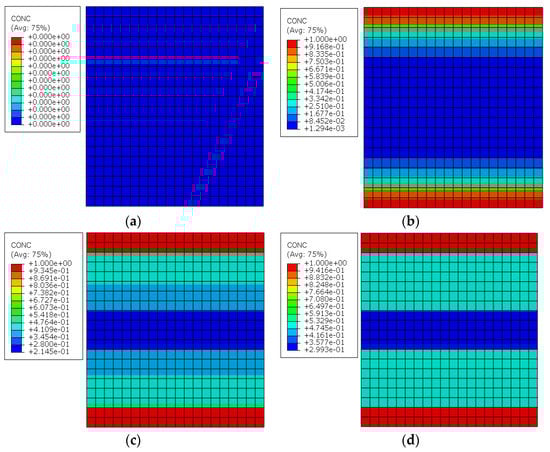 The concentration distribution of sandwich structure: (a) t = 0 h; (b) t = 20 h; (c) t = 200 h; (d) t = 800 h.