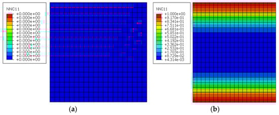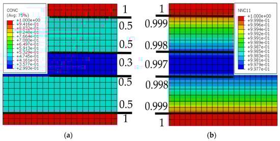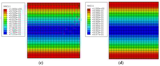 The interface condition will play a very important role for the final results of moisture absorption. By using analytical methods here, we will explain the details of concentration at the interface. For example, the concentration and normalized concentration distributions at the interface of case 1 are shown in Figure 6 and Figure 7. The concentration distributions were calculated by Abaqus, and depicted at t = 0 h, 20 h, 200 h, 800 h. Figure 6a and Figure 7a represent that both concentration and normalized concentration at t = 0 h are 0, however, when t = 20 h, the normalized concentration is continuous while concentration is discontinuous, this phenomenon is shown in Figure 6b and Figure 7b. When t = 200 h and t = 800 h, we can find clearly results that the normalized concentration at the interface is still continuous. However, concentration is totally discontinuous, as illustrated in Figure 6c,d and Figure 7c,d. To better conclude the difference between concentration and normalized concentration, we give FEA comparison results when t = 800 h as shown in Figure 8. From this picture, it is obvious that the concentrations have a jump value (1 vs. 0.5, 0.5 vs. 0.3) at the interface, while the normalized concentration is continuous (1 vs. 0.999, 0.998 vs. 0.997). Thus, the normalized concentration continuity condition can more accurately describe the concentration distribution sandwich structure.