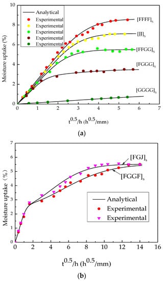 Figure 9 shows the analytical and experimental results of weight gains of [FFFF]S, [JJ]S, [FFGG]S, [FGGG]S, [GGGG]S, [FGJ]S, and [FGGF]S. The moisture diffusion parameters of single layer flax fiber composite, glass fiber composite and jute fiber composite can be obtained from the moisture uptake curve of [FFFF]S, [GGGG]S and [JJ]S, and the values are given in Table 4. It can be found from Figure 9 that the analytical values calculated by the moisture diffusion model were in good agreement with the experimental results for different layer sequences, [FFGG]S, [FGGG]S, [FGJ]S, and [FGGF]S. The experimental results of [FFGG]S and [FGGG]S represent two-phase moisture diffusion cases; it was proven that the proposed model can also deal with two-phase moisture diffusion cases. The experimental cases of [FGJ]S and [FGGF]S were also carried out to validate the moisture diffusion cases, and the good results were achieved.