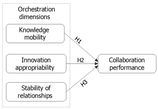 Ritala et al. [33] found that individual skills and organizational capabilities have a major influence on the three analyzed dimensions. The orchestration dimensions introduced by Dhanaraj and Parkhe [36] were investigated in the context of different industries, such as tourism [35], biopharmaceutical [39] or social entrepreneurial venture [40]. At the same time, the approach of Dhanaraj and Parkhe [36] has been applied to both large industries and small and medium-size enterprises [41]. Regarding the orchestration of research and development networks, it is considered a challenging task [24,42]. Drawing on Dhanaraj and Parkhe’s framework [36], Levén et al. [42] examined how the relationships between industry, researchers, and public authorities were managed in cross-industry collaboration. As a result, they presented a model of managing research and innovation networks. The model of Levén et al. [42] emphasized the outcomes in terms of providing both value and economic growth to firms. However, this research is based on a single case study, and future studies are thus recommended to generalize its constructs and propositions. Among the existing research, the work of Hurmelinna-Laukkanen et al. [24] is one of the few studies in which empirical evidence on the influences of different dimensions of orchestration on innovation performance was provided. They investigated the effect of relationships’ orchestration on the success of both the network and individual firm, from the firm’s perspective. Hurmelinna-Laukkanen et al. [24] considered absorptive capacity, innovation appropriability, and network stability as innovation orchestration dimensions, while the alliance success and innovation performance stand for performance effects at the network and individual firm level, respectively. In sum, the framework developed by Dhanaraj and Parkhe [36] considers orchestration as a cause–effect process [43], in which the innovation output is related to the above three orchestration dimensions. Regarding the employment of an orchestration approach in open innovation, this is seen as needed at both internal and external levels to ensure innovation output [44]. Success facilitation of the open innovation processes through orchestration mechanisms simultaneously employed at different levels of innovation networks is also highlighted [45]. However, evidence of the orchestration effects in an open innovation context is relatively scarce and mainly based on qualitative research, such as the explorative single case study in the work of Hu and Sorensen [44] or a longitudinal case study conducted by Schepis et al. [45]. In the study of Hu and Sorensen [44], open innovation and orchestration capability are investigated considering an SME enterprise from a low-tech industry (i.e., textile manufacturing), based on discussions with its managers and key employees as well as other data collected from different annual reports and information available on the firm’s website. The longitudinal case study of Schepis et al. [45] is based on in-depth interviews with participants from start-ups, SME enterprises, and large firms in the mining, oil, and gas industry, which are part of an open innovation network facilitated by an intermediary organization. To sum up, these studies are limited to one single firm [44] or one single industry [45], without taking into account the impact of the orchestration dimensions on the performance of open innovation. Hence, quantitative research that examines how an orchestration approach influences open innovation performance should be performed in future studies [45].