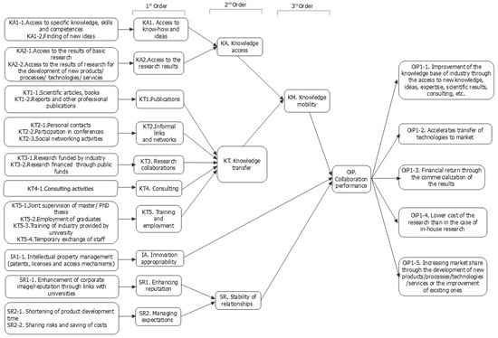 Taking into consideration the above argumentation and hypotheses, we developed a research model based on a hierarchical component structure. Figure 2 presents the constructs of the theoretical model and the measures behind each construct, which are grouped into different categories considering the literature recommendations as described next. Following Dhanaraj and Parkhe [36], knowledge mobility, innovation appropriability, and stability of relationships were considered the main orchestration dimensions that influence the performance of open innovation between industry–university. We conceptualized knowledge mobility as a third-order construct with two second-order latent variables as indicated by Milwood and Roehl [35]: knowledge access and knowledge transfer. Based on the work of Băban et al. [60], these second-order constructs in turn comprised two and five first-order latent variables, respectively. According to Dhanaraj and Parkhe [36], innovation appropriability was proposed as a first-order construct and stability of relationships as a second-order construct with two first-order latent variables. In line with the approach of Dahlander and Gann [48], collaboration performance included both pecuniary and nonpecuniary rationale dimensions. Regarding the observable variables in Figure 2, they were all adapted from Băban et al. [60].