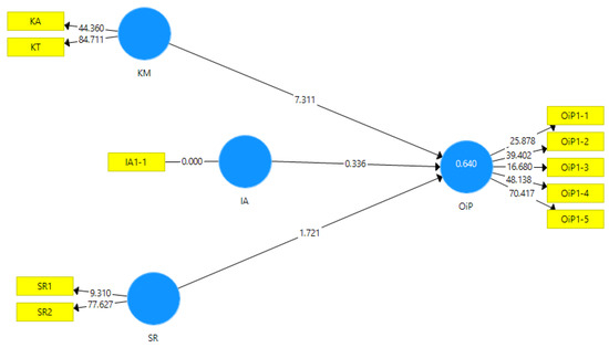 In the initial phase, the path model was developed by linking only the lower-order components of each KA, KT, IA, and SR construct to the OiP construct. Table 2 presents the measurement properties of the model developed in this phase. The outer loadings of all indicators in the model were greater than 0.708, so they were all kept in the model. The conservative Cronbach’s alphas of all lower-order components were above the threshold of 0.70, except for the KT3 component, which was marginally lower than this value. Nevertheless, Cronbach’s alpha may decrease in exploratory research to a minimum value of 0.60 [77]. In addition, the ρA measures of the construct reliability of all lower-order components were above the value of 0.7. Most of the Cronbach alphas and ρA measures were between the recommended 0.70–0.90 values, apart from SR2 and KT1, which were just above 0.90 and the maximum of 0.95, respectively. Therefore, we may consider that internal consistency reliability was established. Regarding the convergent validity, the average variance extracted values (AVEs) in Table 2 were greater than 0.5 for all lower-order components, which indicates a satisfactory level of convergent validity.