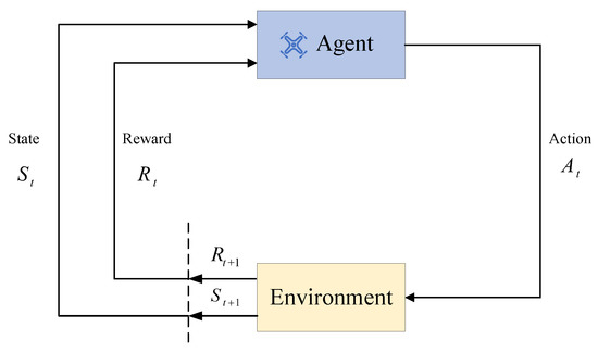 In this paper, the attitude control is regarded as a Markov decision process (MDP), which can be modeled as , where S represents the state space, A is the action space, is the state transition model, signifies the reward function, and is the discount factor. The MDP means that, at every timestep, the agent in state takes action , reward is obtained, and the state is transited to . A generic flowchart of the process is shown in Figure 3.