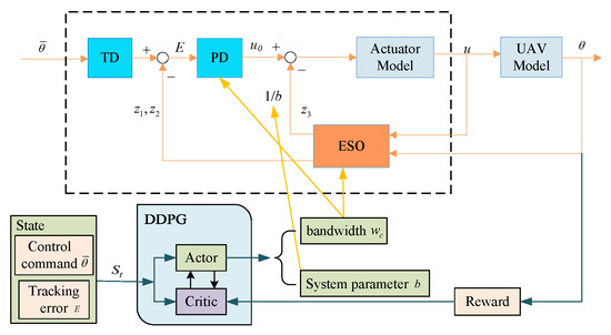 As a feedback-based controller, the inputs of DDPG-ADRC include the control command and the tracking error. Then, the outputs of DDPG are used to update the parameters in ADRC, which means the estimation of system parameters b and the bandwidth of the controller . On one hand, the parameter b reflects the gain from the input to the output of the system, which is related by the system parameters. On the other hand, to compensate for the total disturbance, is added to the PD controller, which means that b affects the compensation for disturbances. Meanwhile, the bandwidth of the controller, , directly determines the performance of the PD controller, and the bandwidth of the observer, , determines the performance of the ESO, where . An overall structure of the proposed fault-tolerant controller is shown in Figure 5.
