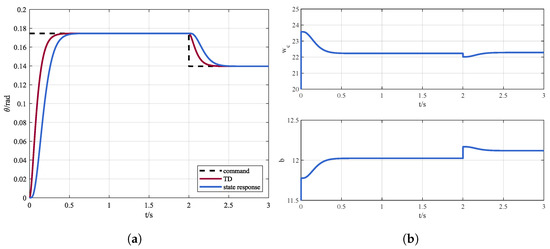 In order to verify the effectiveness of the proposed DDPG-ADRC method, simulations under internal disturbance conditions are presented. The pitch channel of the quadrotor tracks a step command of , and the command reduces to 2 s later. The response is shown in Figure 6a, and the outputs of RL, i.e, the bandwidth of the controller and the estimation of the system b are displayed in Figure 6b.