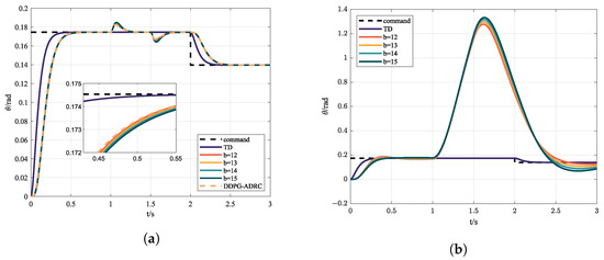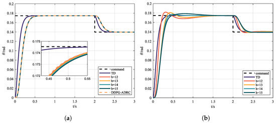 In order to demonstrate the advantages of dynamic parameter adjustment, the steady results are used as fixed parameters, i.e, . Figure 7a shows the response of the system and Figure 7b reveals the differences between traditional ADRC and DDPG-ADRC in compensating for total disturbances.