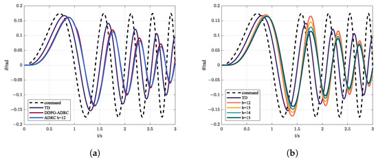 However, as described in Section 2.2, when there are internal disturbances, B = in Formula (3) turns into . The difference between b and reduces the robustness of the system. The presence of the observer in ADRC allows the total disturbances to be observed, which means that . Then, the internal disturbance can be compensated for.