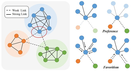 To learn graph data representation, every relationship in the graph should be converted into a feature space that can be further processed to address the downstream tasks [6,7]. However, by merely learning graph-structured data, the embedding space learned by the model may be historically biased. Another thing, which also matters a lot in real-world network representation, is that current models generally neglect the differences in link strength when implementing social network predictive learning. Links in real-world networks apparently are meaningfully different from each other [8]. Previous studies have well-investigated link strength and categorized it into two classes, i.e., strong links and weak links [9,10] (Figure 1). Strong links are found within communities, indicating that two vertices are tightly connected, while weak links connect different communities, meaning that two vertices are loosely connected. In most social networks, vertices are densely linked within a community, whereas they are sparsely linked across communities. As a result, strong links outnumber weak links. Graph predictive learning models will naturally output biased learning results with those unbalanced distribution data.