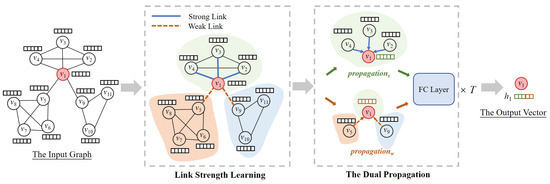 where represents the vertical concatenation of two vectors. is the weight and is the bias. Such a combination impartially integrates information from strong and weak neighbors, avoiding the problem of bias towards one side. After obtaining , we can proceed to input it into the dual propagation so that can receive information from 2-hop neighbors. With such dual propagation conducted T times, every vertex reaches neighbors in T hop.