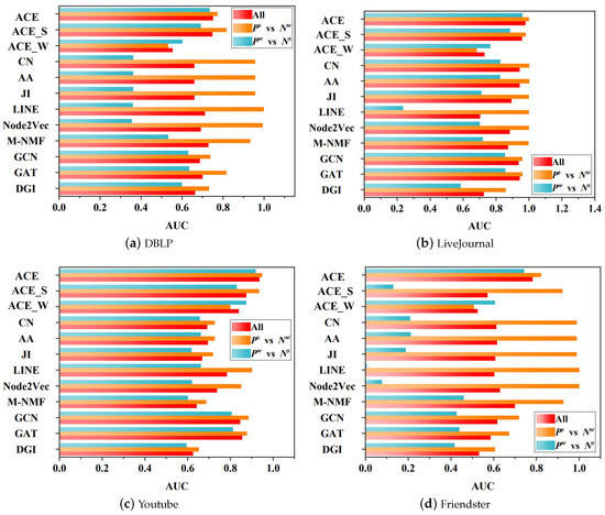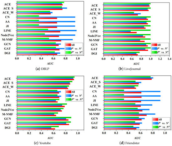 For embedding-based methods, the embedding dimension is set to 128, and other parameters are set according to the original papers. For GCN and GAT, we extend them to supervised learning using the defined score function Equation (15). For ACE, all parameters are initialized by the way described in the paper [40]. Then, we use Adam for a fast convergence [41,42] with = 0.001 and with = 0.5 [43] to learn these parameters. Two hyper-parameters and are set to and 0.5, respectively. We use a two-layer auto-encoder with the hidden and output layer sizes set to 512 and 128, respectively, and conduct the dual propagation two times with two embedding dimensions set to 512 and 128, respectively. During training the ACE model, we first pre-train the auto-encoder for 100 epochs. We randomly hide some existent edges as positive examples and randomly select nonexistent edges as negative examples. A total of 10% of each example is used as the validation example. The maximum epoch is set to 1000. All experiments are run 10 times, and the average results are reported. To show the efficacy of predicting strong links and weak links, we consider the following four different examples: