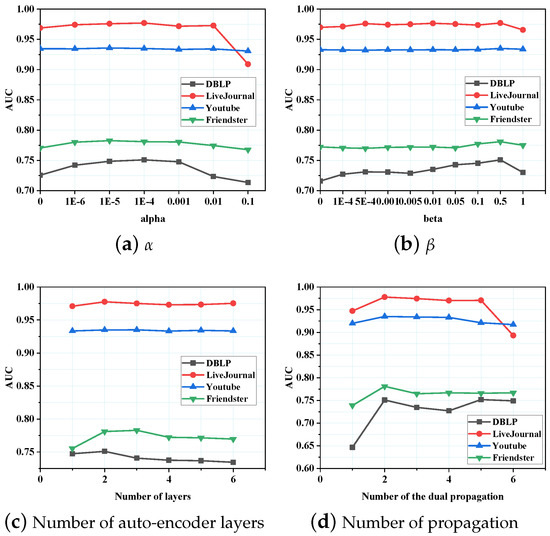 We investigate the parameter sensitivity in this section. Specifically, we evaluate how the parameters , , number of auto-encoder layers, and number of the dual propagation affect the results on the four networks. These results are shown in Figure 5.