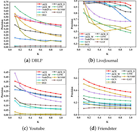 Precision@K.Figure 6 shows the precision of network reconstruction as K ranges from 0.1 to 1.0. It can be seen from the figure that ACE outperforms all baselines and two variants on three datasets, including LiveJournal, Youtube, and Friendster. Although LINE has great superiority when K is less than 0.6, ACE achieves the best performance when K is more than 0.8. These results show that the vector representation learned by ACE better maintains the network structure compared with the baseline and variants. One noticeable finding is that ACE outperforms its two variants, ACE_S and ACE_W, on the four datasets. The improvement of ACE over the two variants demonstrably suggests that keeping the balance between two parts is necessary for network reconstruction. In addition, we can see that ACE_S performs better than ACE_W. This result can be attributable to the fact that strong links outnumber weak links, as demonstrated in Section 5.