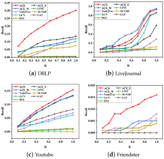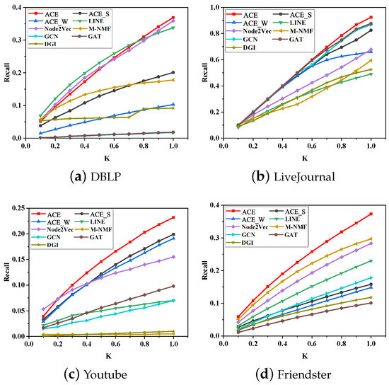 Recall@K. Here, we examine the efficacy of all methods with respect to reconstructing strong links and weak links. A good method needs to reconstruct both strong and weak links well. Figure 7 and Figure 8 show recall@K of reconstructing the two types of edges. ACE, Node2Vec, and LINE achieve similar performance and outperform other methods on DBLP when reconstructing strong links. For weak links, ACE significantly outperforms all baselines. At this time, Node2Vec and LINE show weak competitiveness to ACE. On the other three datasets, ACE keeps its great superiority and outperforms baselines, with the exception of reconstructing weak links on LiveJournal, where ACE_W is the best. Another significant improvement of ACE is reconstructing weak links on Friendster, where recall@K of four methods stays at 0.0. These results suggest that ACE reconstructs strong and weak links well.