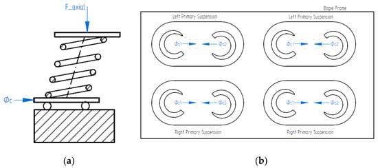 Sauvage [15] and Campedelli [16] studied in detail the behavior of the springs of a bogie and simulated in finite elements the anomaly presented by the springs during axial compression called “effort de chasse”. This anomaly consists of a rotation and a lateral displacement appearing on the bearing surface of the spring. The “effort de chasse”, also called transverse flexibility of the spring, is caused by the forces and moments that appear at the ends of the spring during its axial compression. Campedelli [16] determines that the transverse flexibility is determined by both the geometry of the spring end and the way in which the gap between the coils closes during axial compression. The “effort de chasse” is an interesting anomaly in railway suspension springs since in their displacement the springs could interfere with other mechanical elements of the bogie generating interferences and breakages. To avoid this, the railway standard [17] requires a test for the springs of the highest category according to the scheme in Figure 2a. From the test, both the direction and the transverse bowing force (Φc) of the spring subjected to a defined axial load are obtained. The direction of the transverse direction is marked on the spring by a permanent system to take it into account in its mounting on the bogie. Figure 2b shows an example of a bogie spring assembly compensating for the spring bowing forces.