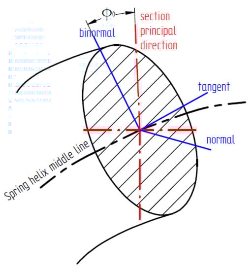 The wave numbers k obtained from Equation (23a–c) are indicators of the spring oscillation modes. Equation (23b) represents the bending oscillations of a differential element of spring length in plane 1, 2 determined by the principal directions of inertia of a cross-section (Figure 6). Equation (23c) represents the torsional oscillations of the differential element around the principal direction 1 of Figure 6. These oscillation modes will be explained also later in the finite elements section.