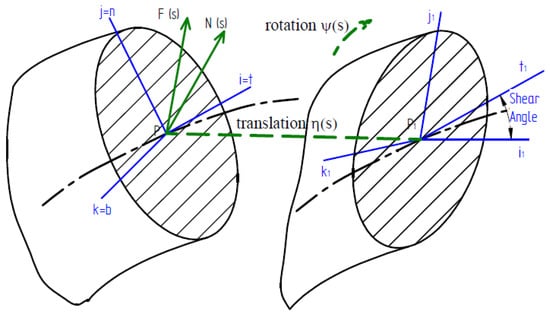 The spring in its natural geometrical configuration undergoes a deformation caused by external forces and moments. The plane cross-section remains plane and we neglect its small deformation. As shown in Figure 5, the cross-section of the deformed part is obtained by a translation of the center and a rotation of the section. Therefore, the point the intersection of the cross-section with the midline, will be transformed into the point (where ) and the perpendicular axes (j,k), coinciding with the normal and binormal of the intrinsic trihedron before the deformation, will become the axes which we also assume to be perpendicular to each other. The axis is obtained as the vector product of the previous ones, .